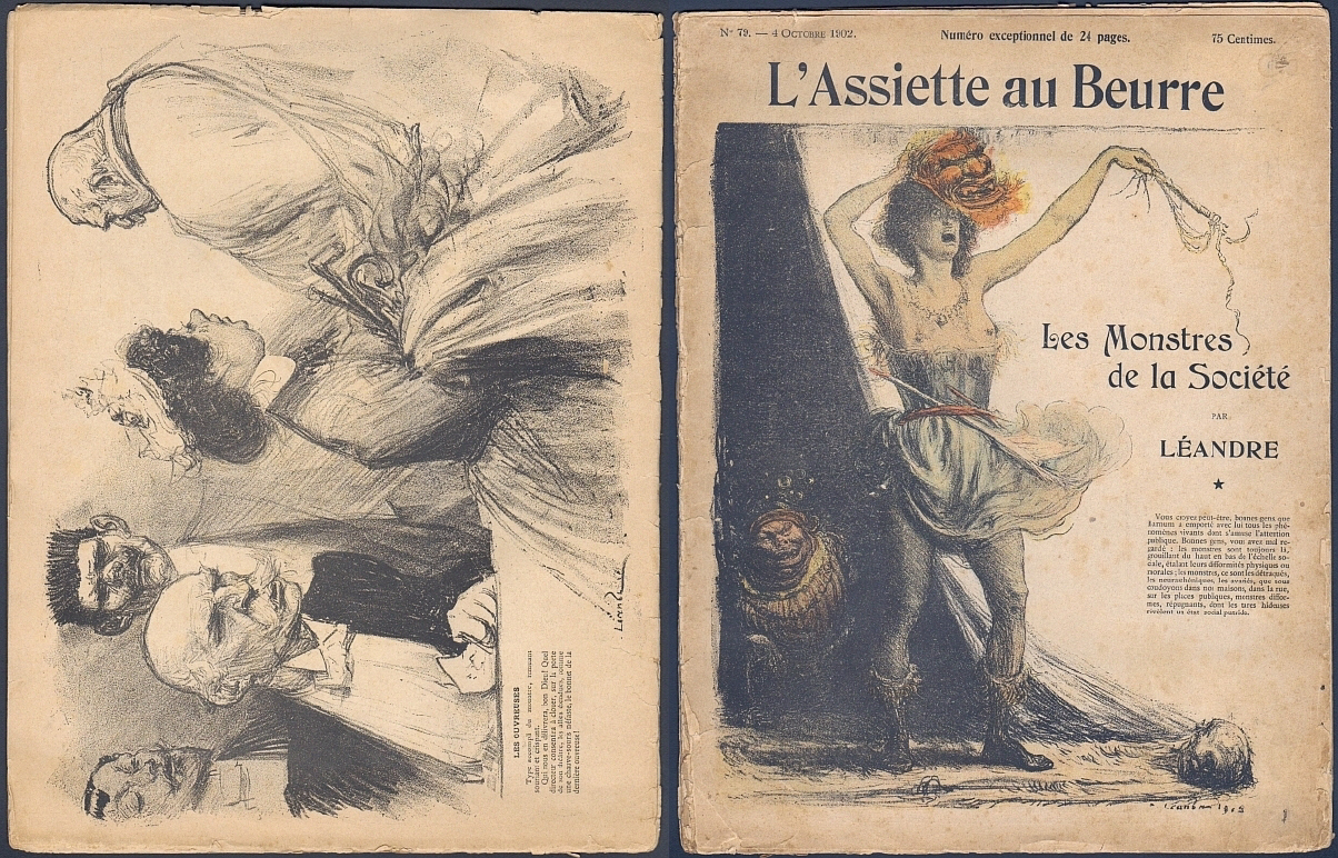 L'Assiette au Beurre. "Les Monstres de la Societe", No. 79, 4 Octobre 1902. (Paris) 1902. 16 Seiten (SS. 558-572), durchgehend illustriert. 31 x 24 cm, farbiges Cover. Von Charles Léandre gestaltetes Heft mit 16 blattgroßen farbigen, getönten und s/w Illustrationen (eine doppelseitig)