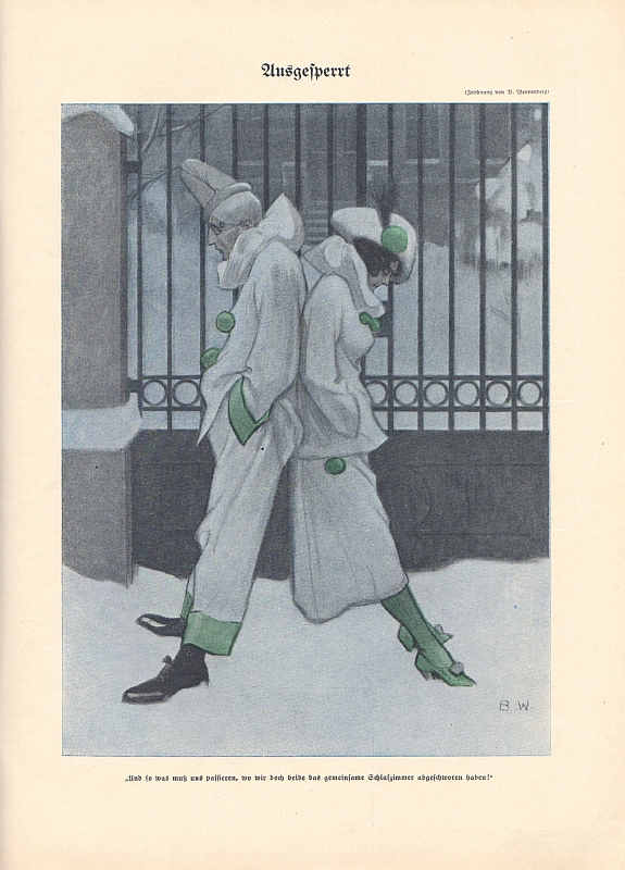 München (Simplicissimus-Verlag) 1914. Unpaginiert (28 S.) mit vielen, teils farbigen Illustrationen von B. Wennerberg, M. Dudovich und Ludwig Kainer sowie zahlreichen Werbeannoncen. 38,3 x 27,8 cm, farbig illustrierte Orig.-Broschur. Umschlagzeichnungen von Brynolf Wennerberg (vorn) und Marcello Dudovich (hinten) = 18. Jg. Heft 54, erschienen am 31.12.1914