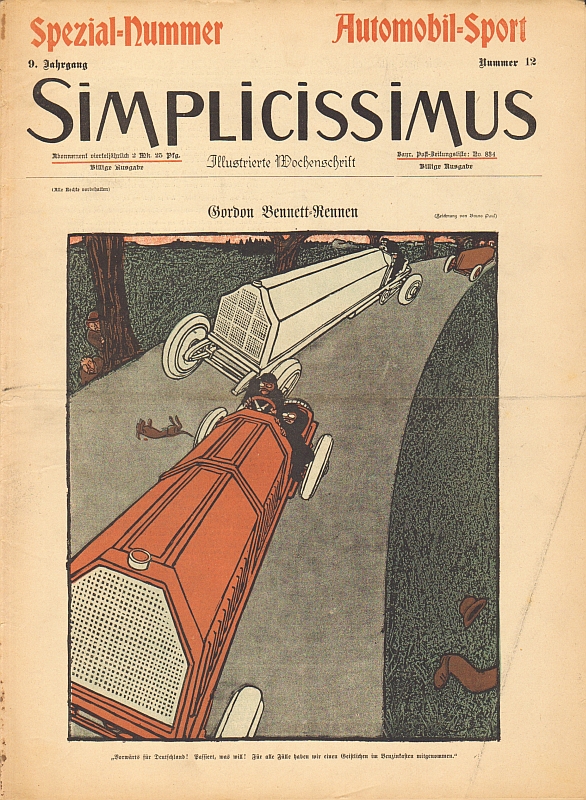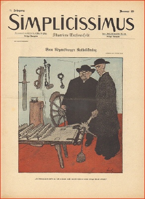 Der Simplicissimus war eine bedeutende politisch-satirische Zeitschrift, die von 1896-1944 erschien. Sie nahm den Obrigkeitsstaat, bürgerliche Moral, Klerus, Kleinbürgertum, Beamte, Spießer, Juristen und Militär aufs Korn. "Der Simplicissimus ist das einzige illustrierte Kunst- und Kampfblatt Deutschlands ohne politische Tendenz, geschaffen für alle Freunde und Feinde einer freien Denkungsart." (Eigenwerbung aus dem Gründungsjahr)