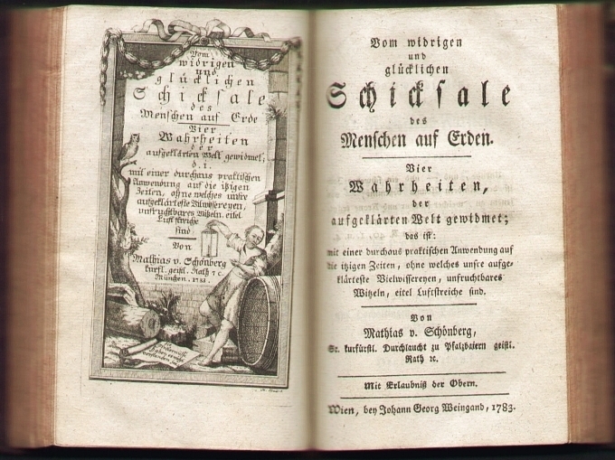 Matthias von Schönberg. [1] Das Geschäft des Menschen. [2] Vom widrigen und glücklichen Schicksale des Menschen auf Erden. [3] Der christliche Philosoph im widrigen Schicksale. [4] Freundschaftliche Erinnerungen an einen jungen Menschen. Wien (Weingand) 1779-1785. 4 Werke in einem Band. Zus. 490 S. Leder d. Zt. mit Rückenvergoldung u. 2 RSchildchen (Einband berieben u. bestoßen, Vorsatz mit Besitzvermerk, erster Titel rücks. mit kl. Stempel). - Schönes, sauberes Exemplar