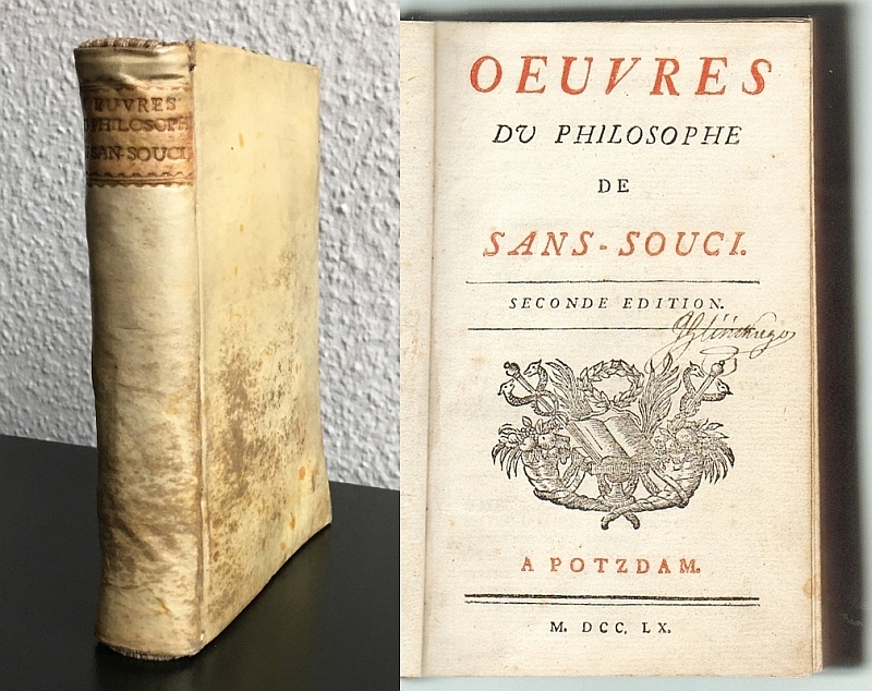 [Friedrich II., König von Preußen] Oeuvres du Philosophe de Sans-Souci. Seconde edition. A Potzdam / Potsdam 1760. Titel in Rot u. Schwarz mit Vignette. VI, 298 S., kl.8° Pergament d.Zt. mit RSchild (Einband etwas fleckig; erstes Blatt mit alt angesetzter unterer Ecke, stellenweise minimal stockfleckig)