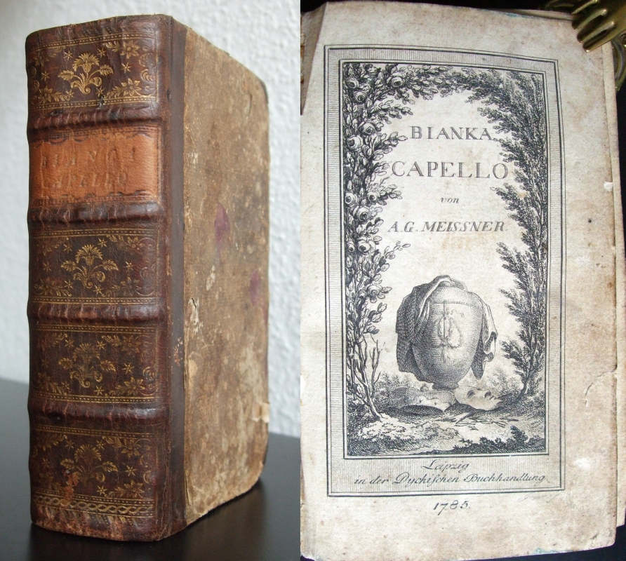 August Gottlieb Meißner: Bianka Capello. Leipzig (Dyck) 1785. Gestochenes Titelblatt (Geyser), 3 Bll, 592 S. Mit 3 gest. Kupfertafeln (Geyser nach Chodowiecki, Chodowiecki, Geyser nach Mechau). Kl.-8° Halbleder d.Zt. mit RVerg. und RSchildchen (bestoßen, Bezugspapier der Deckel beschädigt; flieg. Vorsätze entfernt, Titel angeschmutzt, mit Randeinriss, erstes Textblatt lose; innen teils etwas fleckig)