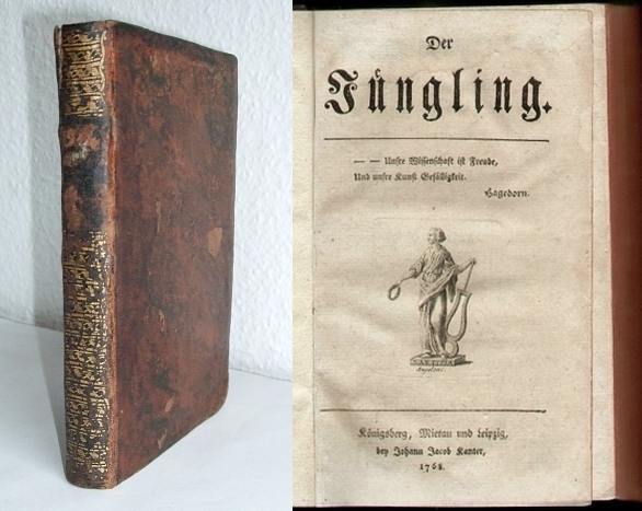 Der Jüngling. Erstes bis vierzigstes Stück (in einem Band). Königsberg, Mietau, Leipzig (Kanter) 1768. Titel mit gest. Vignette; 1 Bl. Vorbericht zur 2. Auflage, 4 Bll. Vorreden, 2 Bll. Inhaltsverzeichnis (aller 72 Stück), 304 S. kl.8° Lederband d.Zt. mit RVerg. (RSchild fehlt, Vergoldung teils abgesplittert, Rücken oben leicht angeplatzt, Deckel mit kl. Schabstellen; Wurmfraßstelle im Vorsatz, Textspiegel gebräunt) - Insgesamt gutes Exemplar des seltenen Periodikums. Mit großem gestochenen Wappenexlibris