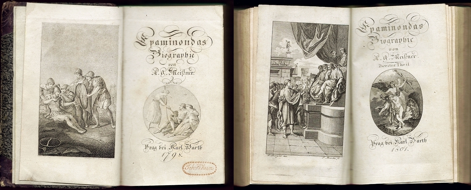 August Gottlieb Meißner: Epaminondas Biographie. 2 Teile in 1 Band. Prag (Barth) 1798-1801. 620 S., 7 Bll. mit 2 gest. Frontispizes von Boettger nach Schubert und von Berka nach Bergler; 2 gest. Titel mit Vignetten; 1 gefaltete kolorierte Kupferstichkarte des antiken Griechenland; kl.8° Halbleder d.Zt. mit 1 (statt 2) RSchildchen (Einband berieben; stellenweise gering stockfl.; Titel von Band 1 mit kl. alten Namensstempel)