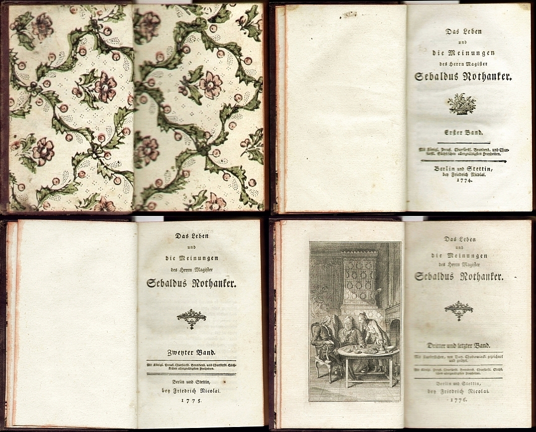 [Nicolai, Friedrich] - Anonym: Das Leben und die Meinungen des Herrn Magister Sebaldus Nothanker. Erster (bis dritter und letzter) Band. In 3 Bänden. Berlin und Stettin (Nicolai) 1774-1776. XIV, 226; 284; 201 S. mit 1 (statt 3) Frontispiz (zu Bd 3) und 12 Kupfertafeln von Daniel Chodowiecki; kl.8° Lederbände d.Zt. mit reicher RVerg., RSchildchen, farbig illustr. Vorsätze (die schönen Einbände etw. berieben, Deckel tls etw. beschabt; Vorrede gebräunt, sonst innen nur vereinzelt stockfleckig oder gebräunt, meist tadellos sauber; im letzten Band zwei Bll. verbunden)