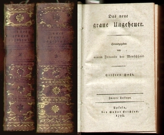 [Rebmann, Andreas Georg Friedrich] - Anonym: Das neue graue Ungeheuer. Von einem Freunde der Menschheit. Heft 7-15 (von 18) in 2 Bänden. Upsala, Bagdad (Erichson) u.a. - fingiert für Altona u.a. 1796-99. Marmorierte Halbleder-Bände d.Zt. mit RVerg., Rotschnitt (RSchildchen entfernt, Rückenvergoldung teils oxydiert bzw. abgegriffen; stellenweise etw. gebräunt). - Gutes, überwiegend sauberes Exemplar