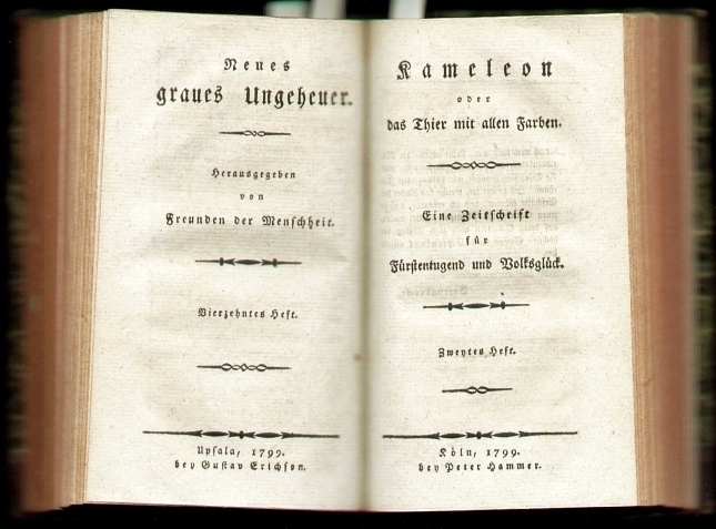 * Nach dem Vorbild von Wekhrlins 'Grauem Ungeheuer' seit 1795 anonym herausgegebenes Journal des demokratisch-radikalen Publizisten Rebmann (1768-1824). Bis 1801 erschienen 18 Hefte. - Heft 7 und ab Heft 12 mit dem Titel 'Neues graues Ungeheuer'. Heft 7-10 (in 1 Band) in erster Auflage. Heft 11 (Nebentitel 'Neuer Niedersächsischer Merkur als Beylage zum neuen grauen Ungeheuer', hier nicht beigebunden) in 2. Auflage. Heft 12 mit Nebentitel 'Niedersächsischer Merkur als Einleitung zum neuen grauen Ungeheuer', fünfte ganz umgearbeitete verbesserte Auflage. Heft 13-15 mit Untertitel 'Herausgegeben von Freunden der Menschheit' und Zusatztitel: Kameleon oder das Thier mit allen Farben. Eine Zeitschrift für Fürstentugend und Volksglück. 1.-3. Heft. Köln (Hammer) 1798-99 (fing. Druckort; Altona od. Hbg. Vollmer). - Der Herausgegeber des 'Neuen Nieders. Merkur' war Friedr.Wilh. Schütz, dessen 'Nieders. Merkur' Ende 1792 verboten worden war. So ist Heft 12 ein Nachdruck einer alten Ausgabe 'Nieders. Merkur'. - Ein Oppositionsblatt von größter Seltenheit.