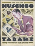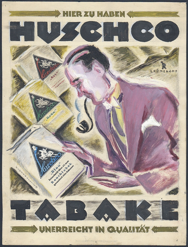 Huschco Tabak. Signierter Originalentwurf für ein Reklameplakat + Plakat-Offset von Ludwig Rümenapf. Hannover ca. 1924. Gouache 36 x 27 cm. Plakat in gleicher Größe, Druck durch Fr. Fricke, Hannover