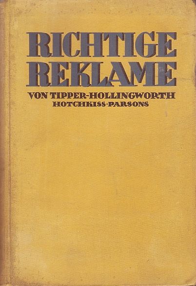 Tipper / Hollingworth / Hotchkiss / Parsons: Richtige Reklame. Berlin (Springer) 1928. VIII, 468 S. mit 122 Abb. im Text und 4 Farbtafeln. Gr.8° Orig.-Leinen (Einband angeschmutzt, innen sauber)