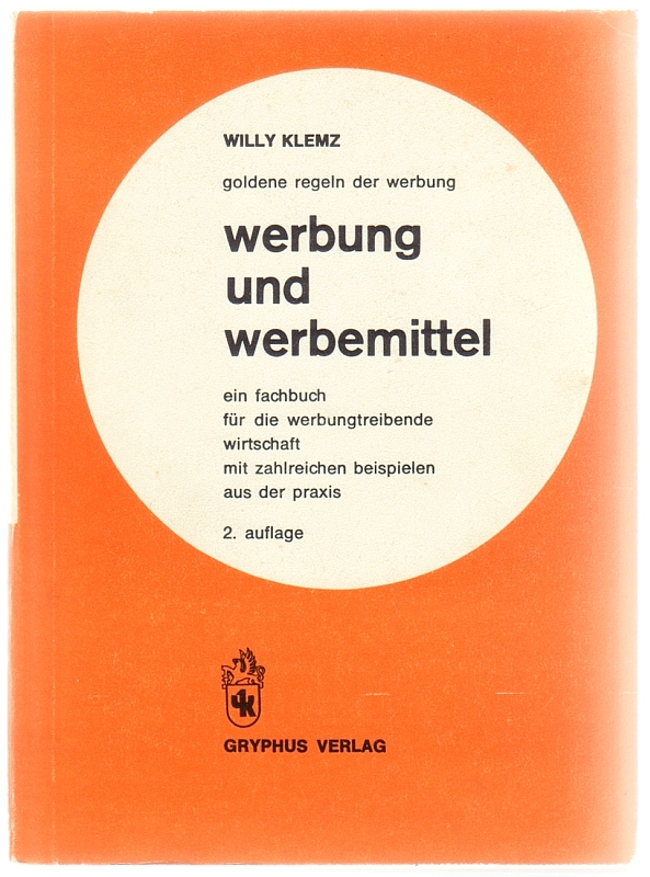 Klemz, Willy: Goldene Regeln der Werbung. Werbung und Werbemittel. Hannover (Gryphus Verlag) 1975. 560 S. mit zahlr. Abb. 16 x 12 cm, Orig.-Karton (Schnitt stockfleckig, innen nur vereinzelt etw. fleckig)