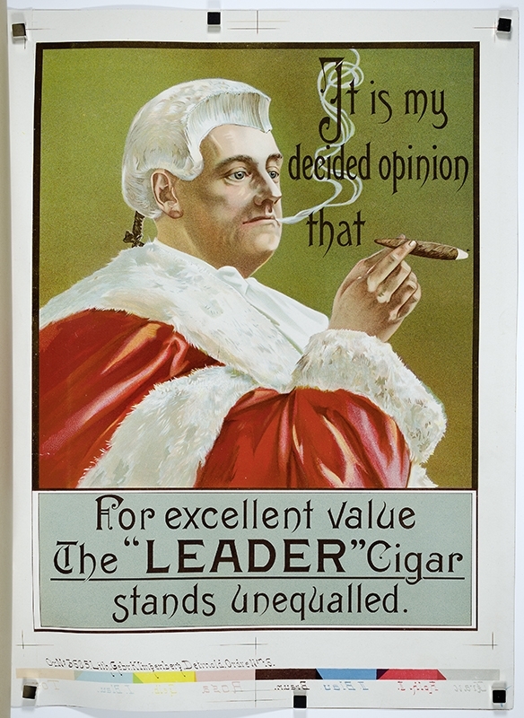 The "LEADER" Cigar. Plakat mit einer Serie von Andrucken. Detmold, Druckerei Gebr. Klingenberg (ca. 1900). 22 Bll. auf Karton und Papier, Chromolithographie. 53,5 x 39 cm, kartonierter Einband mit Titelschild