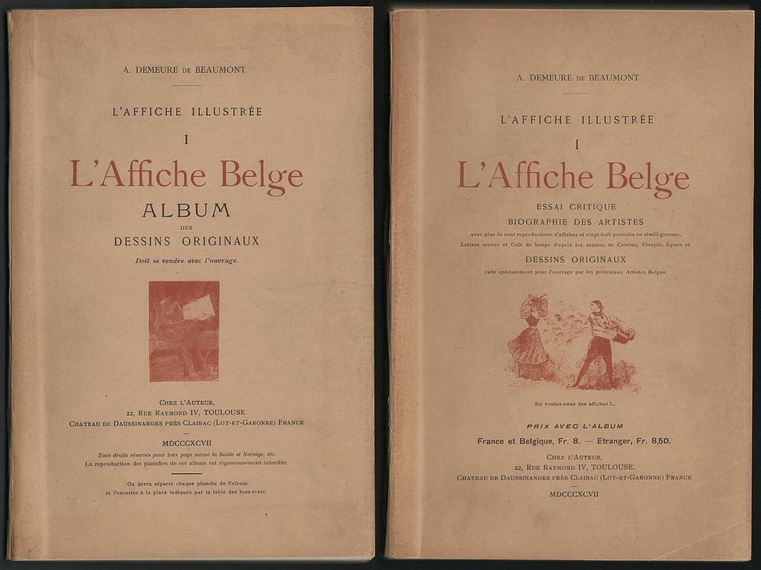 Demeure de Beaumont, A. de: L'Affiche Belge. Essai Critique, Biographie des Artistes + Album des Dessins Originaux. Toulouze (chez l'Auteur) 1897. 95 (2), XXXIII (4) S.; Tafelband mit 18 Tafeln. 24,5 x 16 cm, Orig.Karton