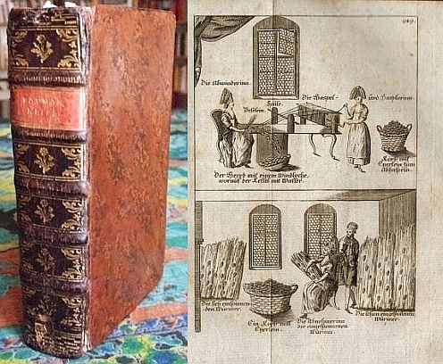 P.C.B. [d.i. P. Christian Baumann] Benützte Reise durch Deutsch- und Wälschland mit angemerktem Hauswirthschaftlichen eines jeden Landes für jedes Land. Wobey das Geheimniß einiger Bauern, durch gewisse Bemühungen und ihnen eigene Griffe reich und begütert zu werden, allen und jeden Bauern und Landleuten entdecket wird. ... Sammt zwoen Tabellen, fünf Kupferstichen und einem land- und hauswirthschafltlichen Kalender. Augsburg (Gebr. Veith) 1782. XVI, 454 S., 24 S. Register, 60 S. Kalender, 1 Bl. Mit 5 teils ausklappbaren Kupfertafeln. Lederband d.Zt. mit reicher Rückenvergoldung u. Rückenschild "Bauman Reise" (Titel mit zeitgenöss. Besitzvermerk; die Tafeln teils etwas unsauber gefaltet, durchgehend mehr oder weniger stockfleckig)