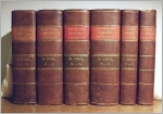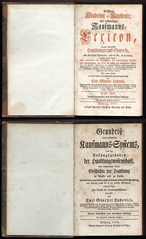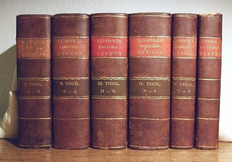 Ludovici, Carl Günther: Eröffnete Akademie der Kaufleute, oder vollständiges Kaufmanns-Lexicon, woraus sämmtliche Handlungen und Gewerbe, mit allen ihren Vortheilen, und der Art, sie zu treiben, erlernet werden können. 5 Bände. - Dazu: Grundriß eines vollständigen Kaufmanns-Systems, nebst den Anfangsgründen der Handlungswissenschaft, und angehängter kurzen Geschichte der Handlung zu Wasser und zu Lande. - Zusammen 6 Bände. Leipzig (Breitkopf) 1767-1768. Einheitlich gebunden. Gr.-8°.Halbleder d. Zt. mit RFileten u. farbigen RSchildern "Ludovici's Handlungs-Lexicon" (die attraktiven Einbände gering berieben u. bestoßen; innen teils gebräunt u. stockfleckig)