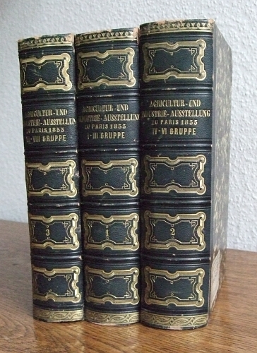 Jonák, Eberhard A.: Bericht über die allgemeine Agricultur- und Industrie-Ausstellung zu Paris im Jahre 1855. 3 Bände. Wien (K.k. Hof- und Staatsdruckerei) 1857/1858. Zus. über 2800 S. mit einigen Abbildungen, 8 gefalteten lithographierten Tafeln, 78-seitigem Register. 24 x 15 cm, Halbleder d.Zt. mit Rückenvergoldung (Deckel mit kl. Bibliotheksschildchen). - Sehr schön erhaltenes Exemplar