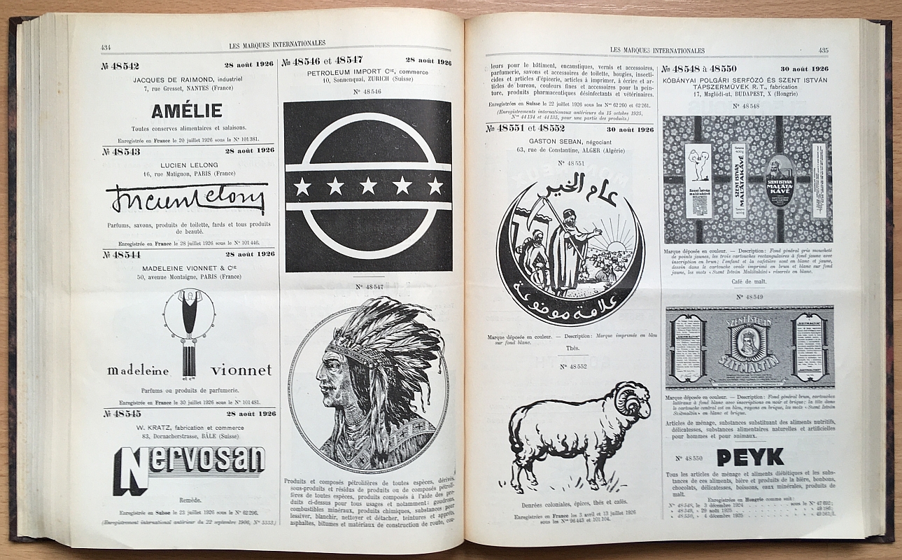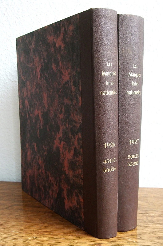 Bureau International de l'Union pour la Protection de la Propriété Industrielle, Berne Les Marques Internationales, 1926-1927 in 2 Bänden. Marques Nos 45147 à 50034 / Marques 50035 à 55289 XXXIV, 630; XXXIX, 704 Seiten, durchgehend mit Abbildungen. 31 x 25 cm, Halbleinen mit RTitel