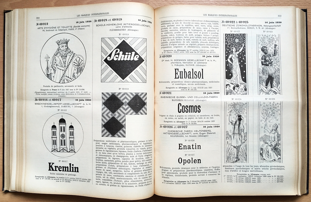 Bureau International de l'Union pour la Protection de la Propriété Industrielle, Berne Les Marques Internationales, 1930. Marques Nos 67183 à 72942 XXXI, 772 Seiten, durchgehend mit Abbildungen. 31,5 x 24,5 cm, Leinen mit RTitel