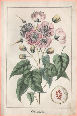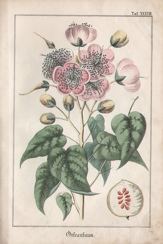 * Die jeweils am Schluss eingebundenen, kolorierten Tafeln zeigen Nutztiere (darunter Wal, Haifisch, Wallroß, Lachs, Stör, Auster, Perlmuttermuschel, Schildkröte, Seidenfalter, Kaschmirziege, Merinoschaf, Bison, Büffel, Strauß) und Nutzpflanzen (Kaffee, Ölbaum, Tee, Reis, Zuckerrohr, Kakao, Hopfen, Mandelbaum, Indigo, Pfeffer, Johannisbrot, Dattelpalme, Lein, Flachs, Baumwolle, Maulbeerbaum, Kurkuma, Orleanbaum, Tabak, Pomeranze, Safran, Ingwer, Koriander, Salbei, Wermuth, Muskat, Vanille, Zimt, Gummibaum, Sagopalme u. a.). Die übrigen 8 unkolorierten Tafeln mit technischen Darstellungen: Kaffee- und Krappmühle, Ölfabrikation, Bierbrauerei, Papierfabrikation, Zuckersiederei, Branntweinbrennerei, Dampfmaschine sowie Herstellung von Koks, Pottasche, Soda, Schwefelsäure u.a.